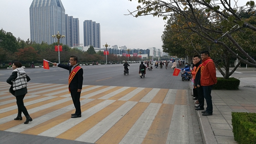 10月26清晨,在勝利東街市級(jí)機(jī)關(guān)綜合辦公大樓西側(cè)的斑馬線前,6名身披紅色綬帶的濰坊民革“博愛”志愿者,正在對過往的車輛和行人進(jìn)行文明疏導(dǎo)。