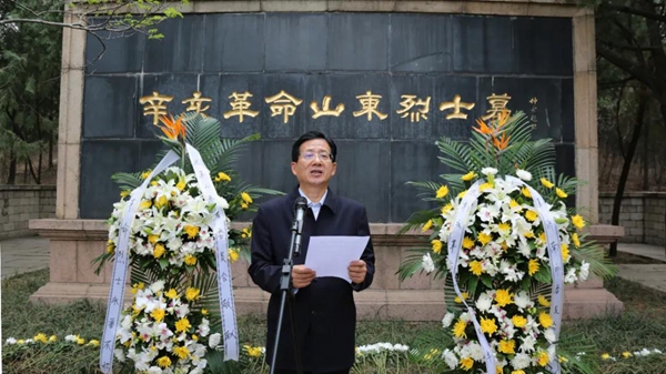孫繼業(yè)、衣光軍代表民革省委、濟南市委向辛亥革命山東烈士墓敬獻花籃。