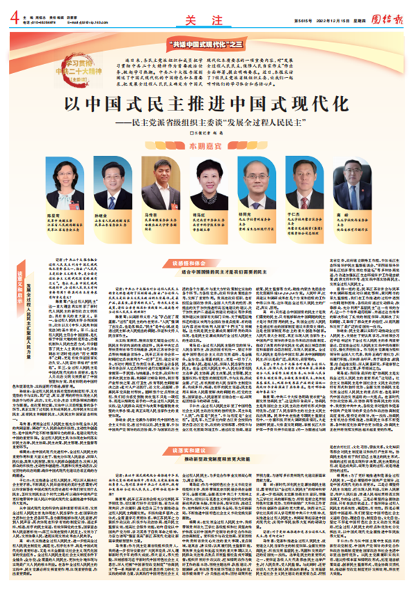 高 嶺:扎實推進全過程人民民主,進一步提高全過程人民民主制度化、規(guī)范化、程序化水平,既是中國式現代化的重要標志,又是未來全面建設社會主義現代化國家的突出任務。全過程人民民主是社會主義制度條件下全鏈條、全方位、全覆蓋的人民民主,更加充分地體現與實現最廣大人民的根本利益。在各種全過程人民民主的實踐中,民主黨派必將發(fā)揮重要作用,體現重要價值,作出重要貢獻。
