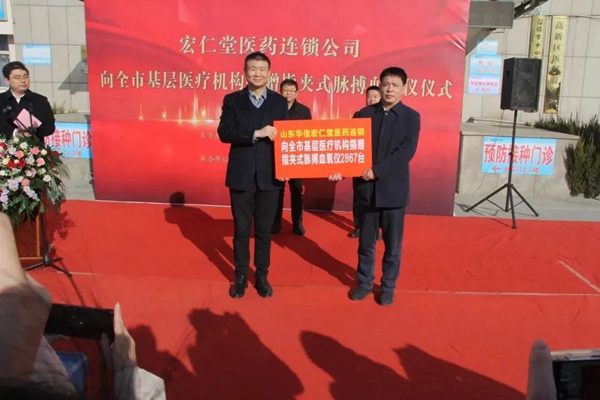 1月9日,山東華信宏仁堂醫(yī)藥連鎖有限公司向淄博市村衛(wèi)生室捐贈(zèng)指夾式脈搏血氧儀儀式在高新區(qū)石橋中心醫(yī)院舉行。在此次活動(dòng)中,山東華信宏仁堂向全市的村衛(wèi)生室捐贈(zèng)2867臺(tái)指夾式脈搏血氧儀,總價(jià)值達(dá)50萬(wàn)元。淄博市衛(wèi)生健康委黨組書(shū)記、主任,市中醫(yī)藥管理局局長(zhǎng)程勤,淄博高新區(qū)管委會(huì)副主任李凱,民革淄博市委會(huì)副主委、山東華信宏仁堂醫(yī)藥連鎖有限公司董事長(zhǎng)張超參加此次捐贈(zèng)儀式。