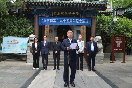 王伯芝代表民革山東省委會、民革濟(jì)南市委會,向在慘案中所有遇難的同胞表示深切哀悼,向?yàn)榱酥腥A民族不畏強(qiáng)敵、英勇抗?fàn)幍南攘抑乱猿绺呔匆?。他指出,近年來,民革相繼開展的“五三慘案”歷史研究和思想教育活動,提出了“修建‘五三’慘案紀(jì)念碑、紀(jì)念館”、“設(shè)立5月3日市警日”等建議,受到中共山東省委、濟(jì)南市委的高度重視,為濟(jì)南市愛國主義教育工作做出了積極貢獻(xiàn)。他強(qiáng)調(diào),全體民革黨員及入黨積極分子要以史為鑒,警鐘長鳴,奮發(fā)圖強(qiáng),勇毅前行,繼承弘揚(yáng)愛國主義優(yōu)良傳統(tǒng),始終堅(jiān)持中國共產(chǎn)黨的領(lǐng)導(dǎo),積極投身中國式現(xiàn)代化的偉大實(shí)踐,為全面推進(jìn)中華民族偉大復(fù)興而團(tuán)結(jié)奮斗。