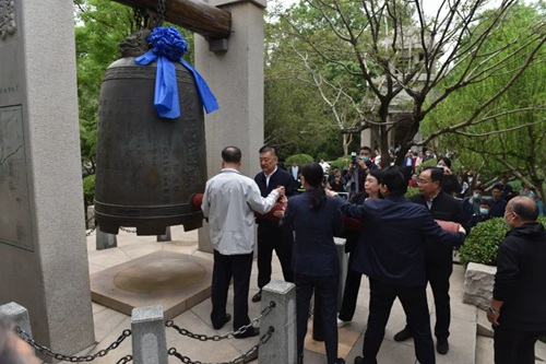 各界代表共同向蔡公時(shí)烈士銅像敬獻(xiàn)花籃并共同敲響五三鐘,凄厲的警報(bào)聲和鐘聲回蕩在空中,既懷念著逝去的亡靈,也警示著世人:國恥永不敢忘!