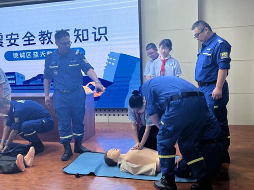 活動(dòng)現(xiàn)場(chǎng),德州市德城區(qū)藍(lán)天救援協(xié)會(huì)的隊(duì)員為師生們帶來(lái)防溺水、急救、地震安全教育等安全知識(shí),并在現(xiàn)場(chǎng)指導(dǎo)學(xué)生們進(jìn)行心肺復(fù)蘇的操作體驗(yàn)。學(xué)生們聚精會(huì)神地聽(tīng)講,專心致志地體驗(yàn)。
