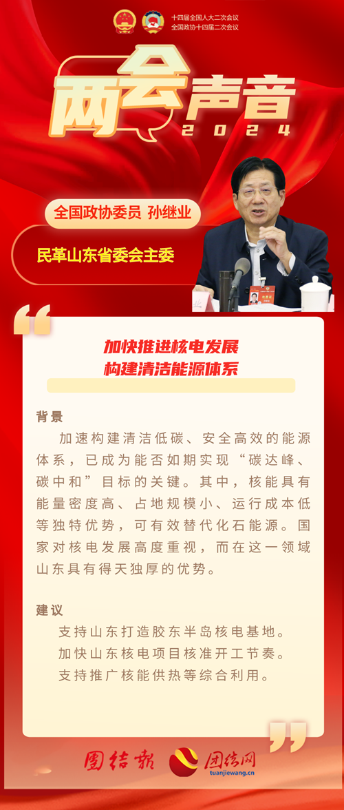 “作為經(jīng)濟(jì)大省、能源消費(fèi)大省,山東發(fā)展核電具有重大戰(zhàn)略意義和現(xiàn)實(shí)意義。從落實(shí)‘雙碳’戰(zhàn)略看,山東省煤炭消費(fèi)占比高,加快調(diào)整優(yōu)化能源結(jié)構(gòu)的任務(wù)尤為迫切?!睂O繼業(yè)呼吁,國(guó)家支持山東持續(xù)把發(fā)展核電作為建設(shè)新型能源體系、扎實(shí)推進(jìn)“雙碳”工作的有力舉措,加快海陽(yáng)、榮成、招遠(yuǎn)等核電廠址開發(fā)建設(shè),打造沿海核電強(qiáng)省。